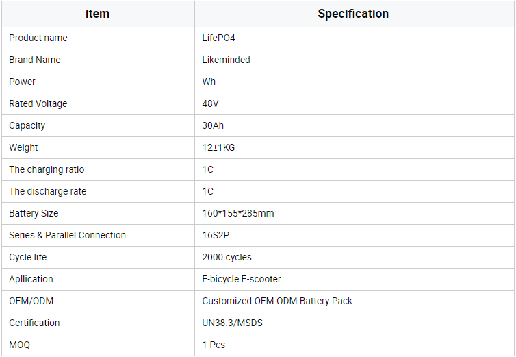 This 48V 30Ah LiFePO4 battery is ideally suited for 48V-powered low-speed transport vehicles like electric bicycles, scooters and small electric tricycles, delivering reliable power and long cruising range for daily commuting, delivery and short-distance travel.